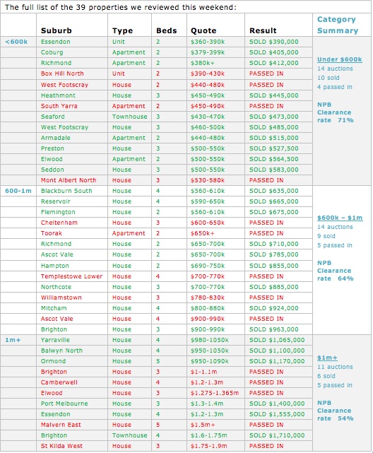 The NPB clearance rate for the week was 64%, with 25 of the 39 properties we reviewed finding new owners. The NPB clearance rate last week was 69%. Not surprisingly, the lower end of the market (under $600k) again outperformed both the middle range and higher end of the market on the weekend with a clearance rate of 71%, even though that is considerably lower than last weeks’ 81%. A total of 10 properties sold from the 14 we reviewed in this category. The middle range category ($600k-1m) had a clearance rate of 64%, up slightly on last weeks’ clearance rate of 62%, with 9 of the 14 properties we reviewed selling. The high end ($1m+) again came in as being the worst performer with a clearance rate of 54%, down slightly on last weeks’ 58%, with 6 of the 11 properties we reviewed being purchased.